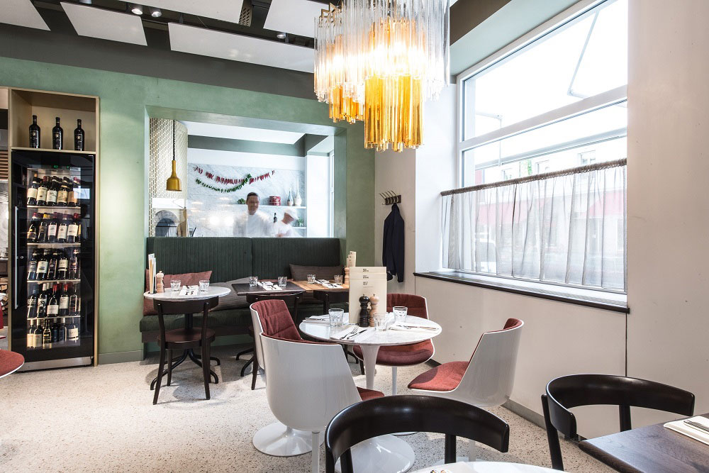 Per l’allestimento e l’arredamento la designer Ushi Tamburiello ha puntato sulla scelta di materiali naturali e ricercati, conferendo allo spazio carattere ed identità, ma allo stesso tempo anche funzionalità. Un’atmosfera di cordiale raffinatezza, raccolta nel legno, cuoio, marmo e ottone che danno forma al ristorante, invita quasi automaticamente a prender posto di fronte ad un buon piatto di pasta. Un tocco di stile contemporaneo e discreto è stato inoltre integrato nella configurazione spaziale. Un forno a legna incorniciato nell’ottone funge da collegamento fra la zona ospiti e la cucina. Alle pareti le credenze di legno, tradizionali scaffali da cucina, trasmettono un senso di autenticità. “Sono come delle finestre che trasportano il nostro ospite in quei luoghi dove le nostre specialità sono state prodotte: in Italia” dice Ushi Tamborriello. Il pavimento di terrazzo chiaro si estende per tutto il locale, mentre pregiati candelabri conferiscono al locale un’aurea di nobiltà. L’ospite entra, prende posto all’entrata per un caffè e un dolce veloce o a tavola con la famiglia e gli amici: appunto, come in Italia.